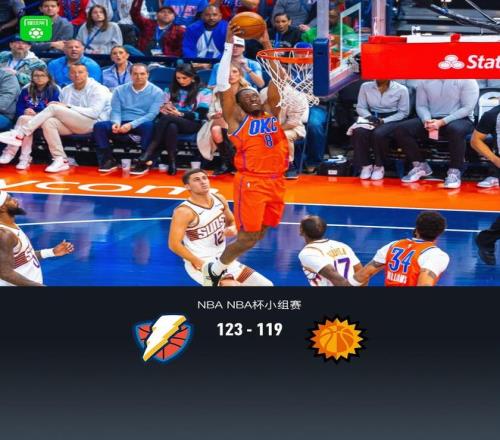 北京時間11月29日NBA NBA杯小組賽,俄克拉荷馬雷霆對陣菲尼克斯太陽。半場雷霆56-52太陽,最終雷霆123-119太陽。俄克拉荷馬雷霆亞歷山大37分3板8助,霍姆格倫23分8板1助;菲尼克斯太陽吉萊斯皮24分3板4助,德文-布克21分8板6助。